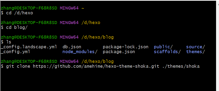 下载完后发现在 D:/hexo/blog/themes/ 下出现了 shoka 文件夹,把文件夹里( D:/hexo/blog/themes/shoka/ )的 _config.yml 复制一份(里面是主题配置的所有参数)到根目录下( D:/hexo/blog/ )(blog 里存放着自己网站的所有配置文件和自己想要上传到网上的内容 md 文件,所以是根目录),并命名为 _config.shoka.yml ,方便主题升级(先不对文件修改)。根目录下本身已经有一个_config.yml,是站点配置文件。(内容说明来自主题配置建议)。
