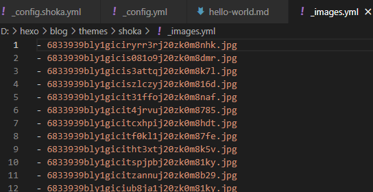 打开 _images.yml 文件可以看到里面存放的都是一些图片名称,需要注意的是这些图片都没有在前面显示网址,这是因为上传后图片的链接是 http://wx4.sinaimg.cn/large/6833939bly1gicmnywqgpj20zk0m8dwx.jpg 。只需要新一行写上 - 6833939bly1gicmnywqgpj20zk0m8dwx.jpg 即可。