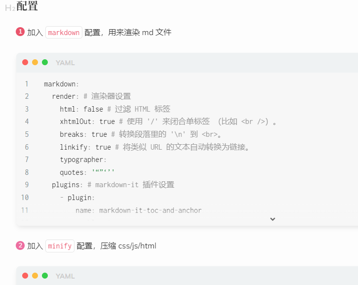 安装完两个插件后,把配置里关于 makedown , minify , autoprefixer , algolia 的代码均复制到根目录下 _config.shoka,yml 文件里(feed 配置代码没有复制)。