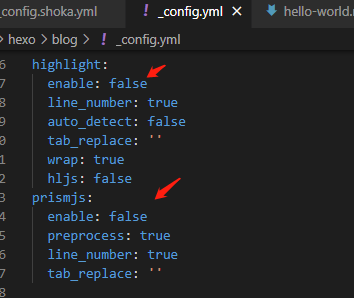 此外,需要注意的是停用代码高亮功能这一步骤,下面的命令不在根目录_congif.shoka.yml,而在 _config.yml 文件里,完成后保存即可。