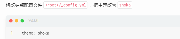 修改根目录下站点配置文件_config.yml,把主题改为 shoka